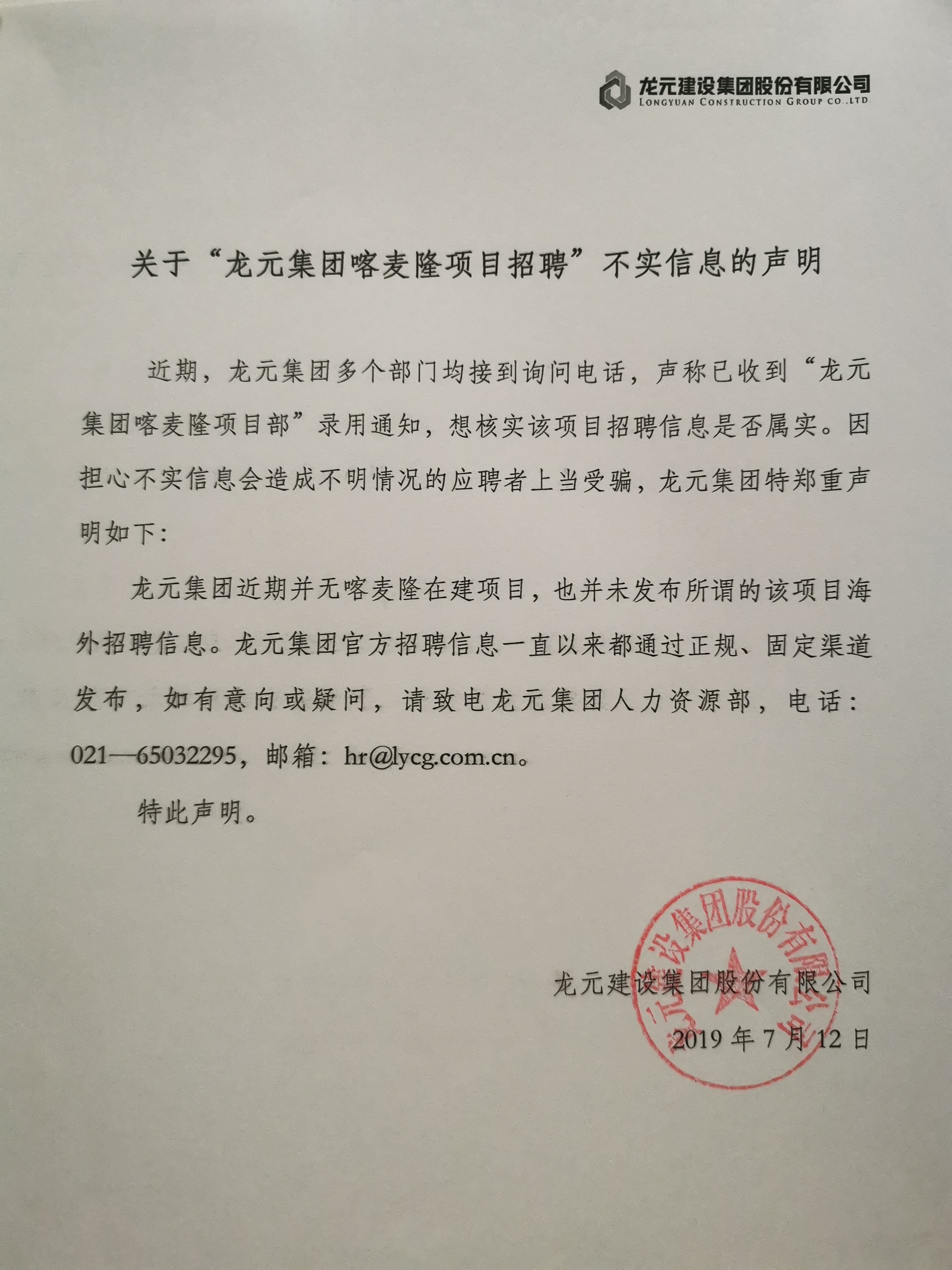 關於“香蕉啪啪视频集(jí)團喀麥隆項目招聘”不實信息的聲(shēng)明