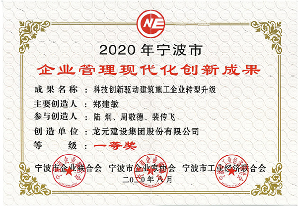 此(cǐ)外,現場還頒(bān)發了2020寧波(bō)市企業(yè)家創業創新獎和企業管理現(xiàn)代化創新成果獎狀和獎牌。集團總裁賴朝暉被授予“2020寧波市企業家創新創(chuàng)業獎”,集團創(chuàng)造的《科技創(chuàng)新驅動建築施工企(qǐ)業轉(zhuǎn)型升級》榮獲2020年寧波市企業管理(lǐ)現代化創新成果一等獎。