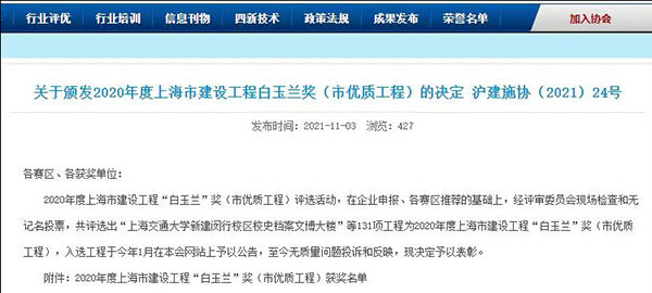11月3日,上海市建築施工行業協會發布《關於頒發2020年度上海市建設工程白玉蘭獎(市優質工(gōng)程)的決定》,香蕉啪啪视频集團承建(jiàn)的老(lǎo)西門中華新城(北地塊)3#樓、4#樓、5#樓榮獲3項“白玉蘭”獎(jiǎng)。