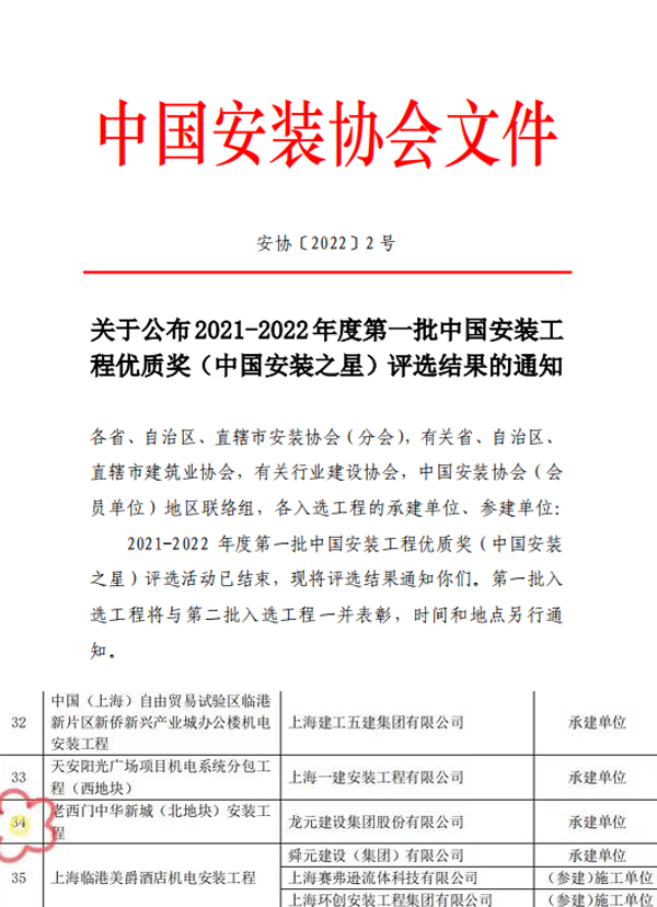20221 月(yuè) 7 日,中國(guó)安裝協會發布(bù)《關於公布2021-2022年度第一批(pī)中國安裝工程優質獎(jiǎng)(中國安裝(zhuāng)之星)評選結果的通知》,香蕉啪啪视频集團(tuán)承建的(de)老西(xī)門中華新城(北地塊(kuài))安裝工程榮獲“中國安裝之星”。