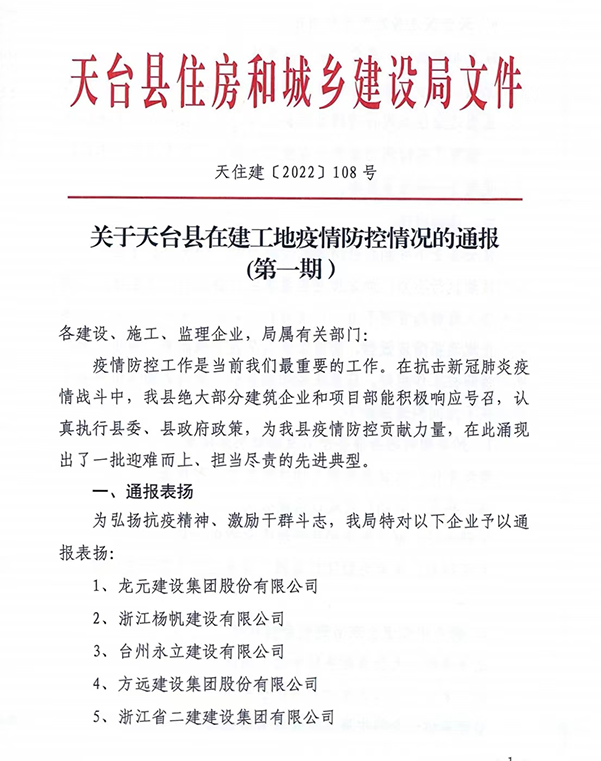 5月1日勞動節(jiē),項目部收(shōu)到了來自天台縣住建局的通報表揚:“表揚香蕉啪啪视频建設能在戰“疫(yì)”危急時刻,主(zhǔ)動馳援,充分發揮企業優(yōu)勢,積極履(lǚ)行縣裏政策要求,對縣內封控區周邊(biān)全區域(yù)進行硬隔離防護工作,用自己的方式(shì)支援疫情防控,譜(pǔ)寫了新時(shí)代企業的社會責任與擔當,為天台縣抗擊(jī)疫情防控築起了一道堅實屏障。”