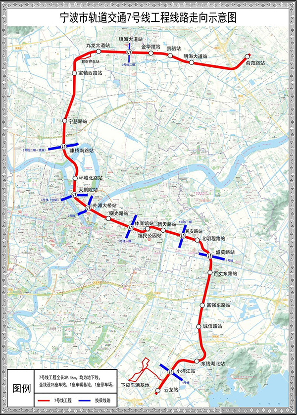 寧波軌道交通7號(hào)線,是寧(níng)波市城市軌道交通第三期建設規劃中的重要項目之一。7號線是寧波軌道交通主幹線的輔助線,分擔城市南北(běi)向發展的客流。項(xiàng)目一期南起鄞州區(qū)雲龍站,經過(guò)下應(yīng)街道、東(dōng)部新(xīn)城、三江口和鎮海新城等重(chóng)點區(qū)域,北至鎮海區俞範東路(lù)站。線路全長(zhǎng)39.4km,全部為地下站,全線設25座車站,線路分別(bié)在北端聯(lián)群設停車場1座和鄞州下應設車輛基地1座,平均站間距1.6km。