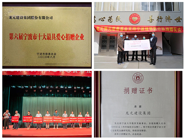 此外(wài),集團還積極參與(yǔ)社會公益(yì)活動,主動承擔社會責任,在愛(ài)心助(zhù)學、扶貧(pín)幫困(kùn)、社會捐贈、疫情防(fáng)控等方麵積極捐款(kuǎn)捐物。2007年起,集團公司連續15年在象(xiàng)山(shān)縣慈善總會建(jiàn)立幫困基金。今年,集團與象山縣慈善總會攜手,繼續設立為期10年的“香蕉啪啪视频慈善濟困”冠名基金,積(jī)極參與家鄉的經濟(jì)社會(huì)建設。2020年起,集團向寧波大學捐資打造寧波大學龍(lóng)元建築金融(róng)研究院,為家鄉建築業的轉型升級培養人才以及輸出(chū)高質量的研究成(chéng)果。2020年新冠疫情期間捐贈用於援鄂(è)醫療醫護人員,致敬“逆行者”。集團(tuán)還榮獲第六(liù)屆(jiè)寧波(bō)市“十大(dà)最具愛心捐贈企業”、第六屆“寧波慈善獎”捐贈企業獎。