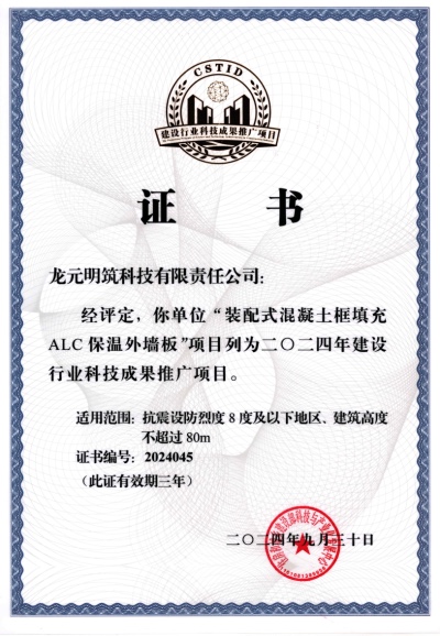 香蕉啪啪视频明築(zhù)自保溫裝配式(shì)外牆板獲評2024年建設行業(yè)科技成果推廣項目(mù)